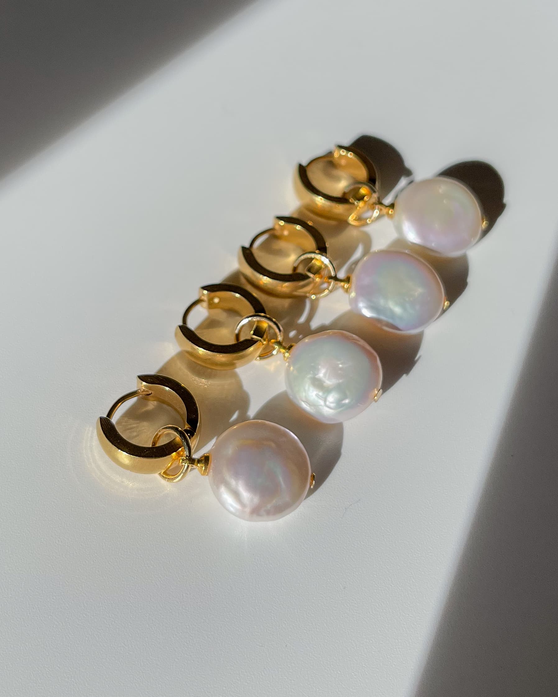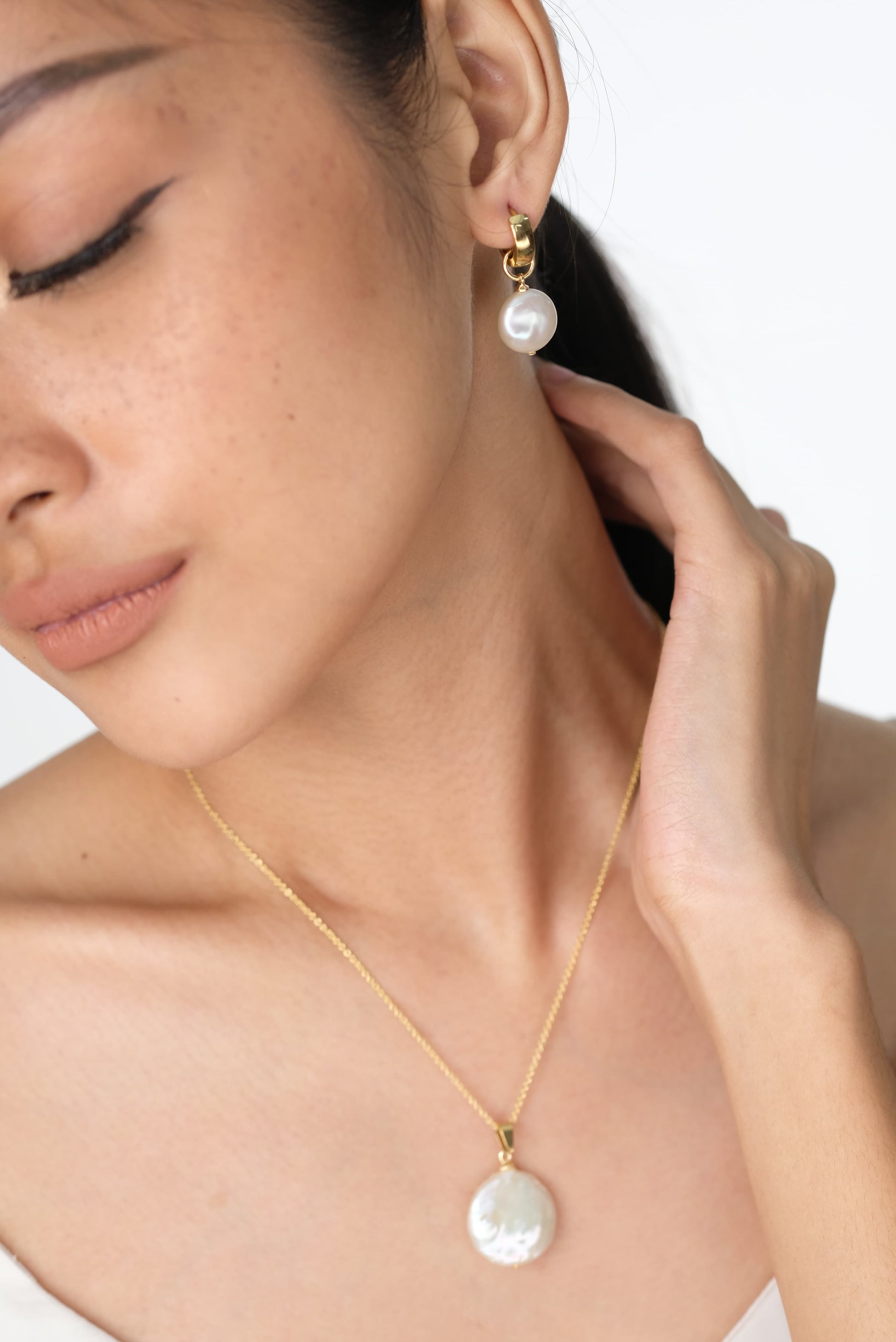 Elevate your look with these versatile earrings featuring luminous handpicked coin freshwater pearls set in gold plated stainless steel.