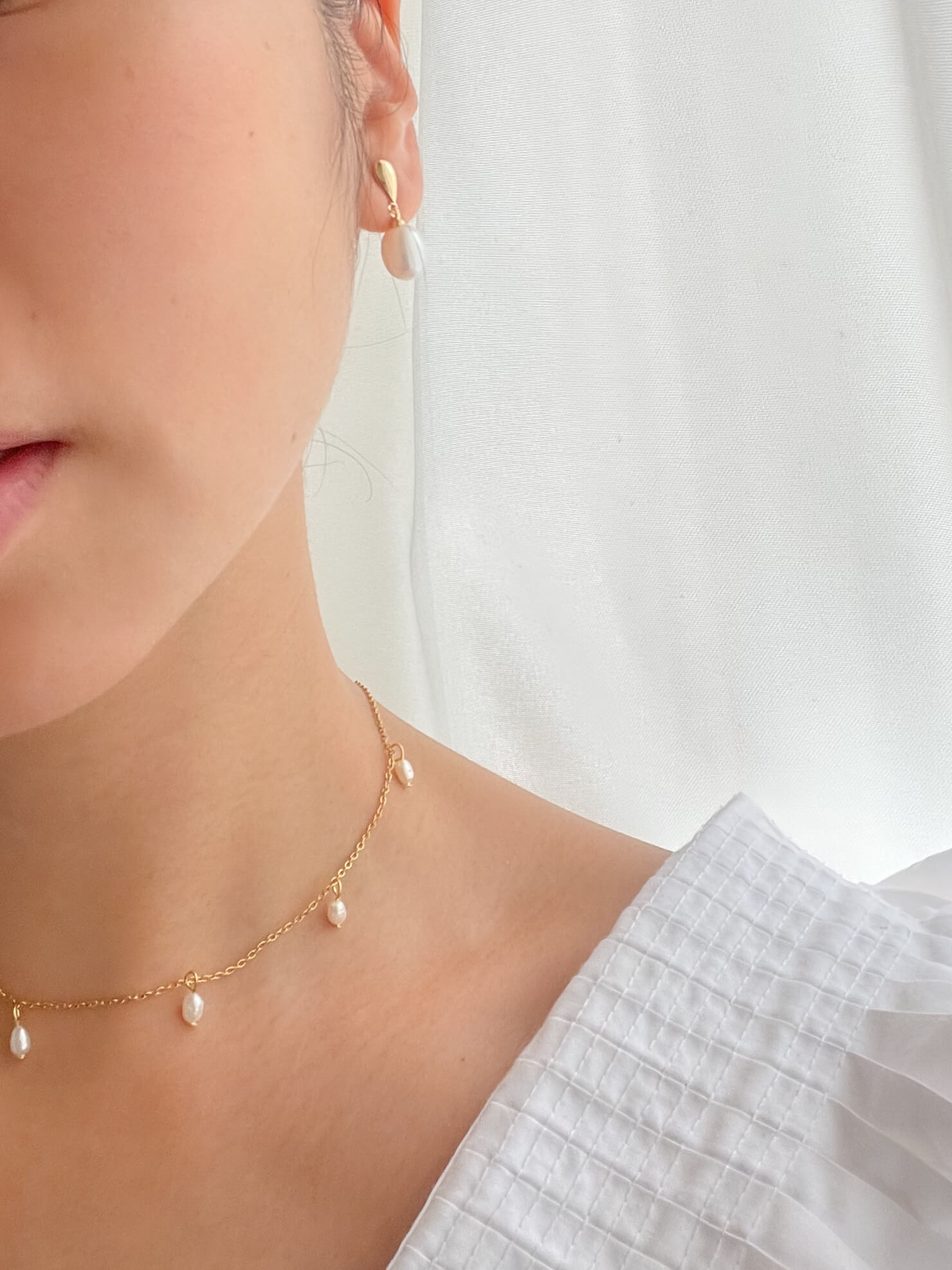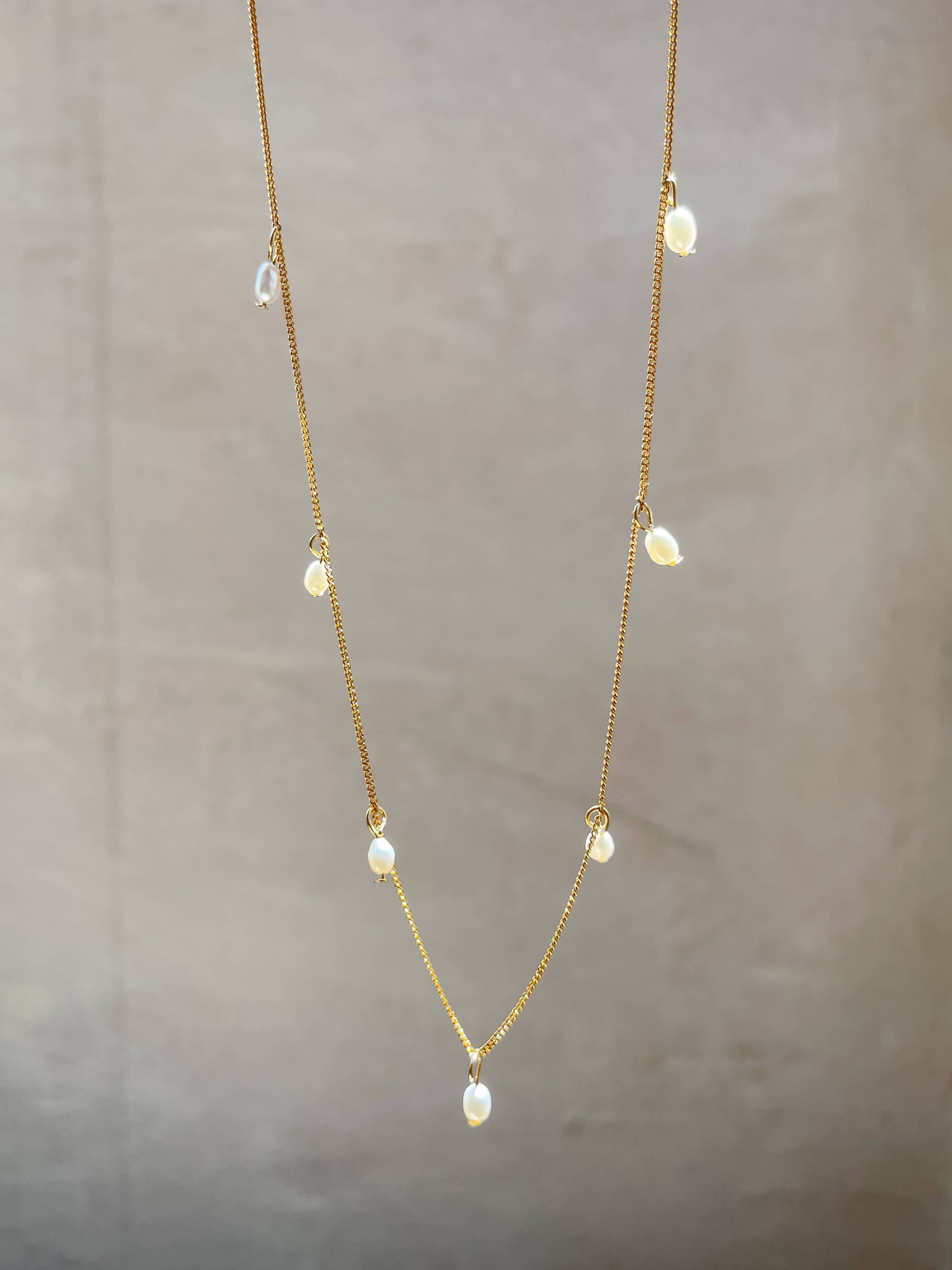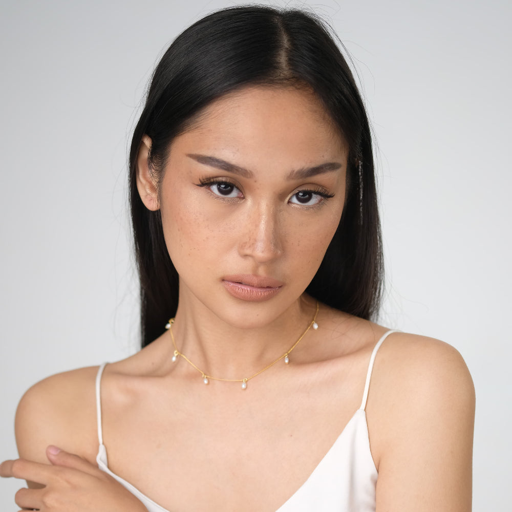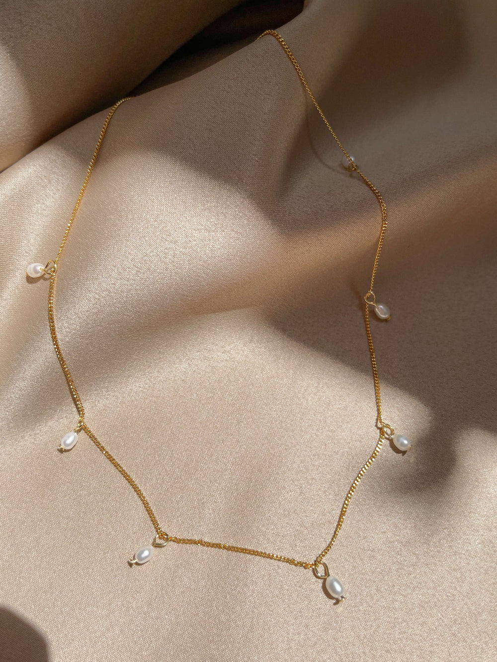 This beautiful necklace features a series of luminous drop freshwater pearls, carefully spaced along a delicate gold-plated chain. Designed with versatility in mind, the Bess necklace is adjustable from 15 to 17 inches, making it a perfect layering piece. Wear it on its own for a subtle statement or combine it with other necklaces to create your own unique stack.