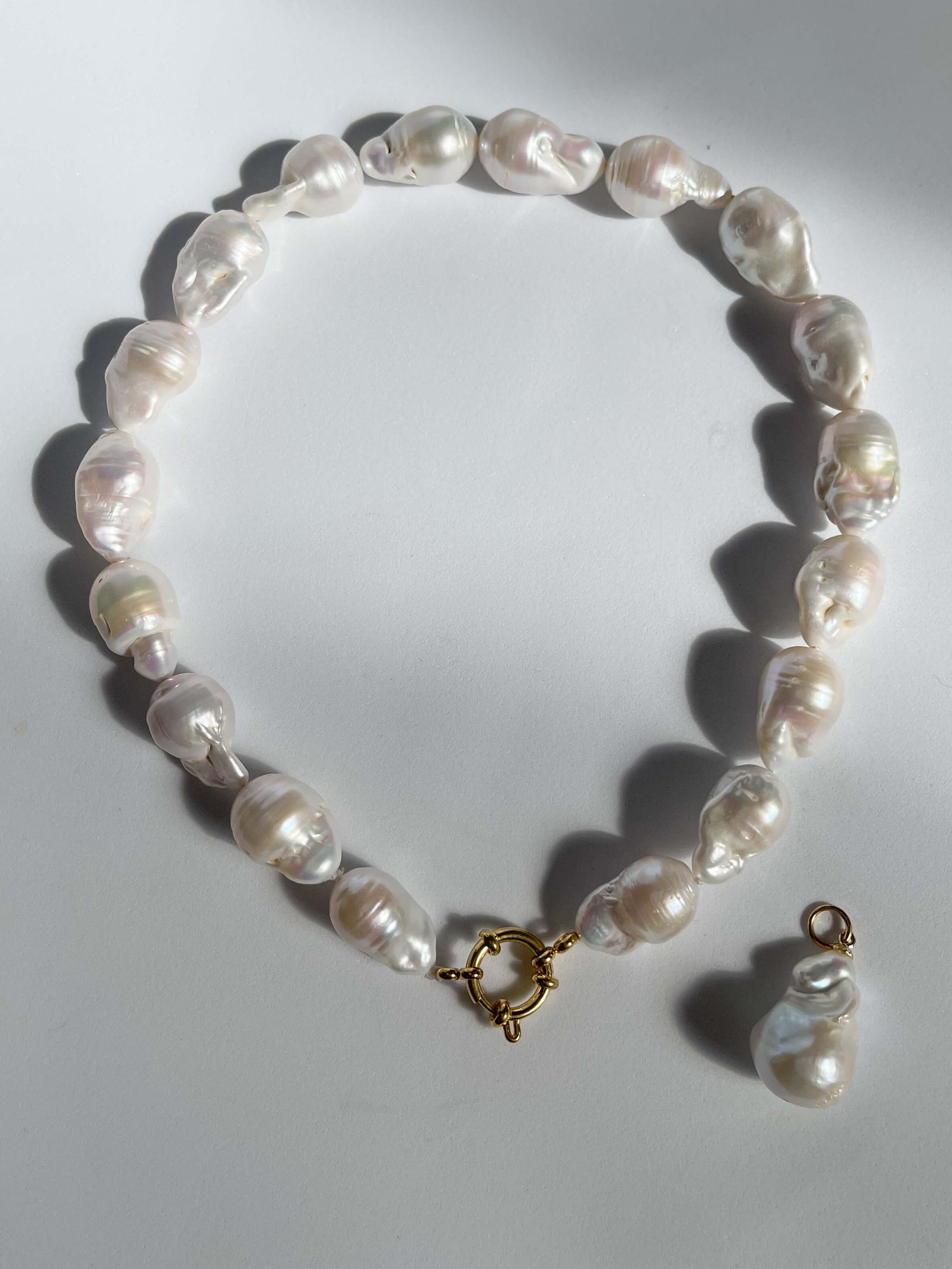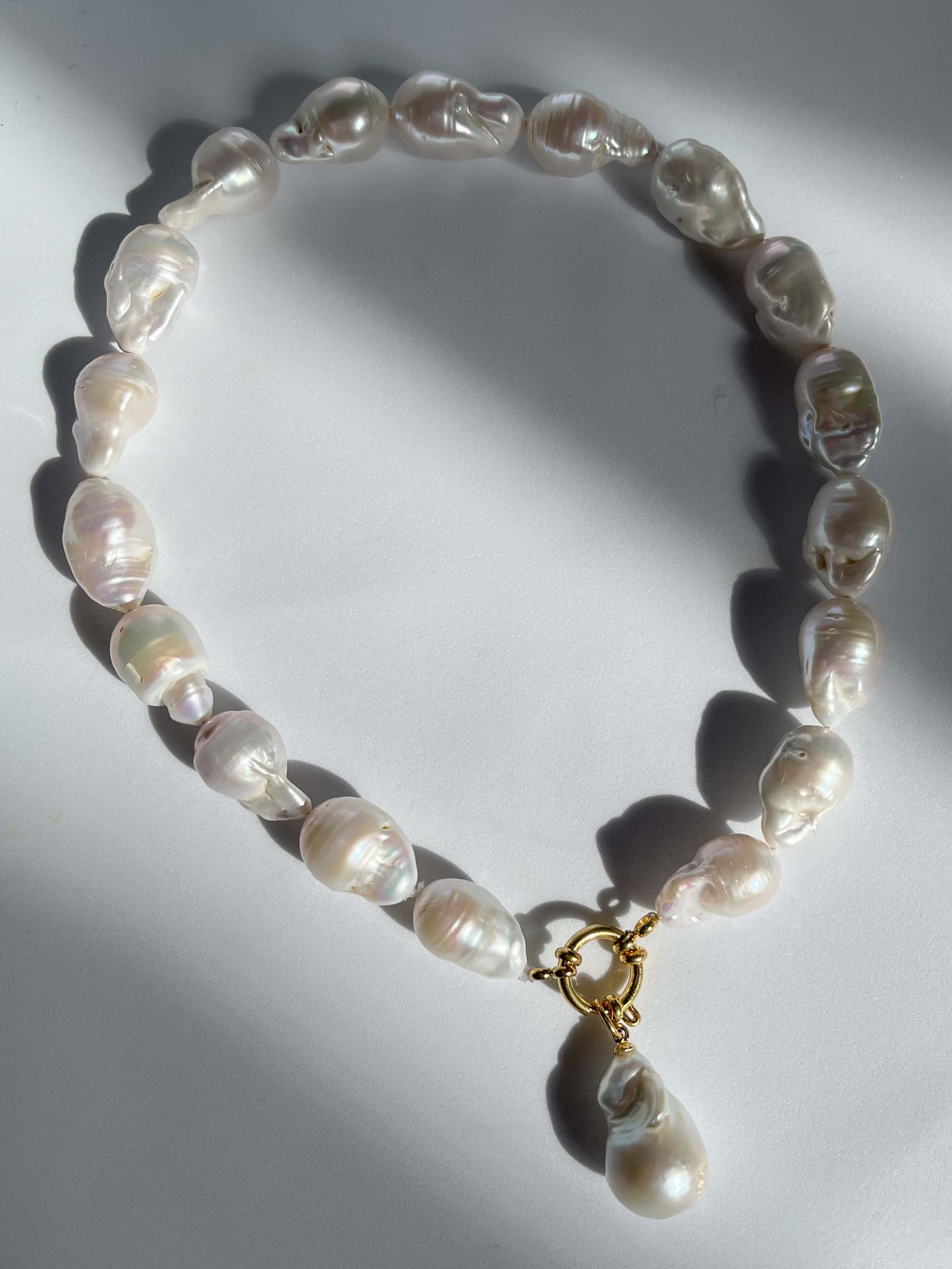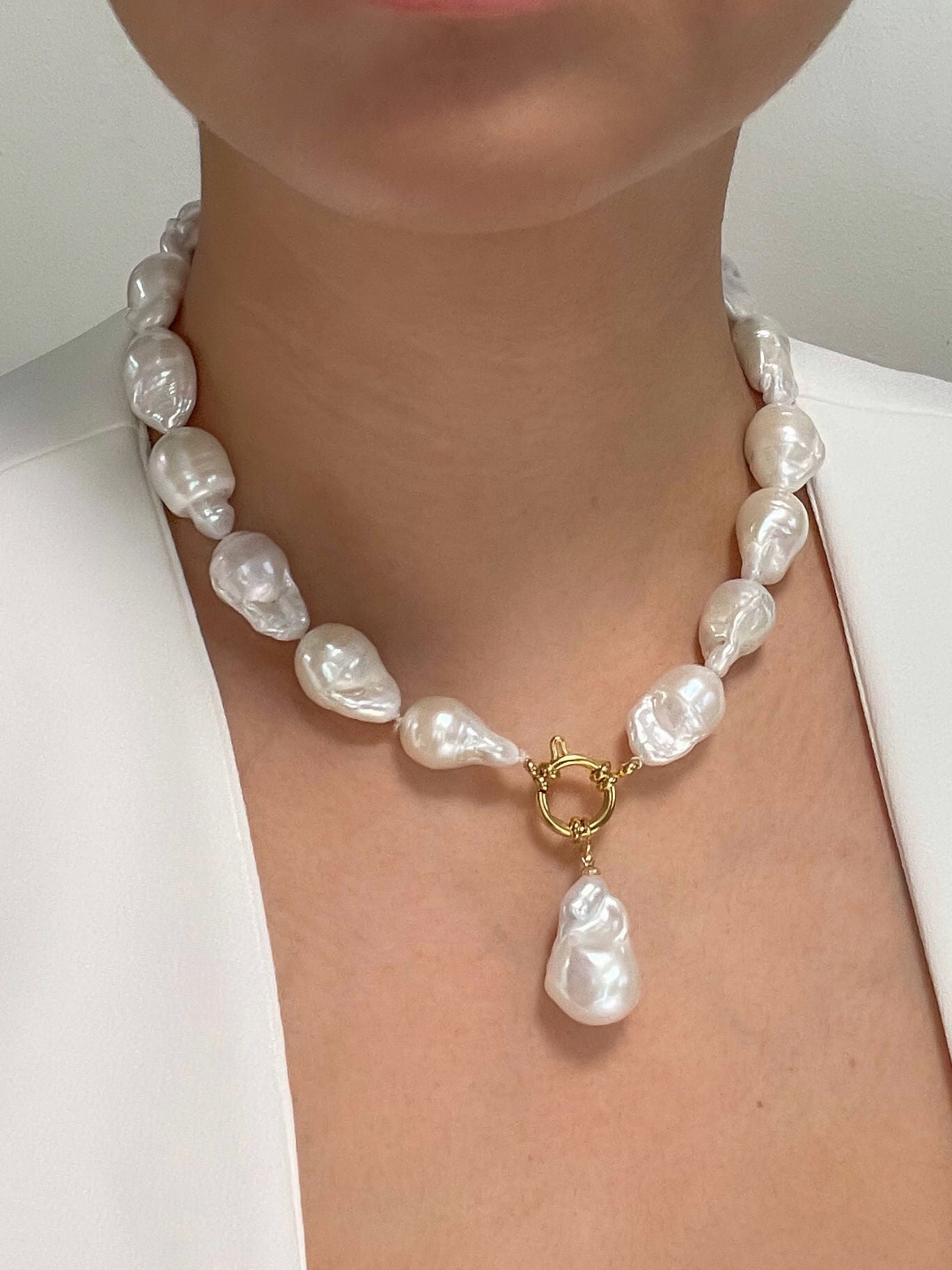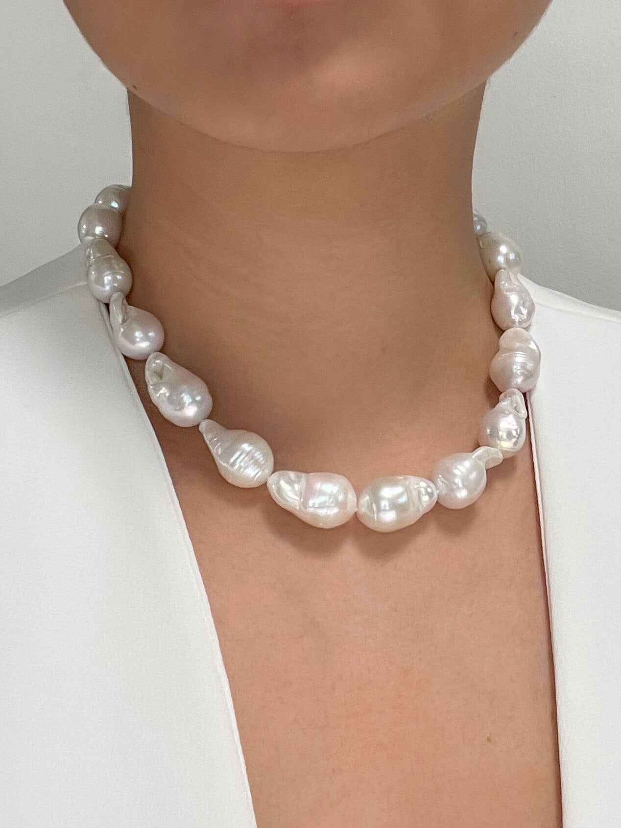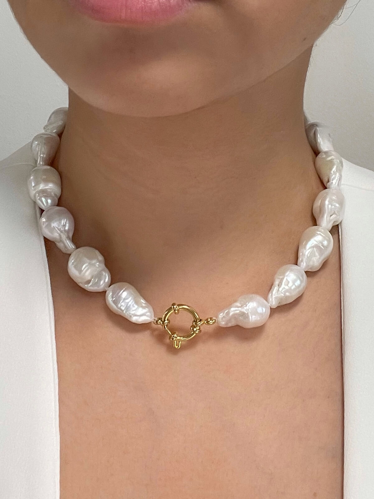 Discover raw and organic beauty of our 12-14mm baroque freshwater pearl necklace. Each pearl is meticulously hand-selected for its unique shape and iridescent luster. Crafted in Gold Plated Stainless Steel lock.