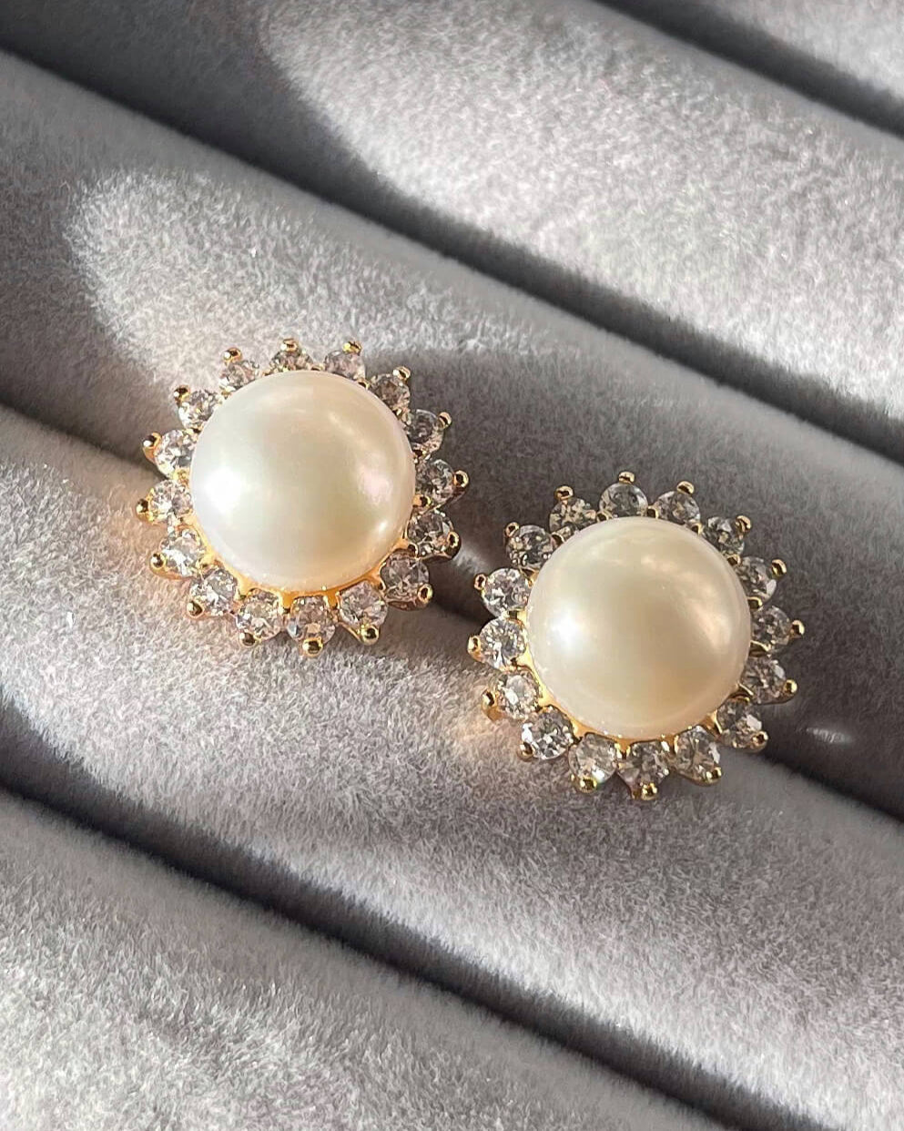 Each earring features a brilliant 10-11 mm pearl at the center, surrounded by a radiant halo of shimmering cubic zirconia crystals. This sunburst-inspired design offers a glamorous and timeless look, perfect for adding a touch of sparkle.