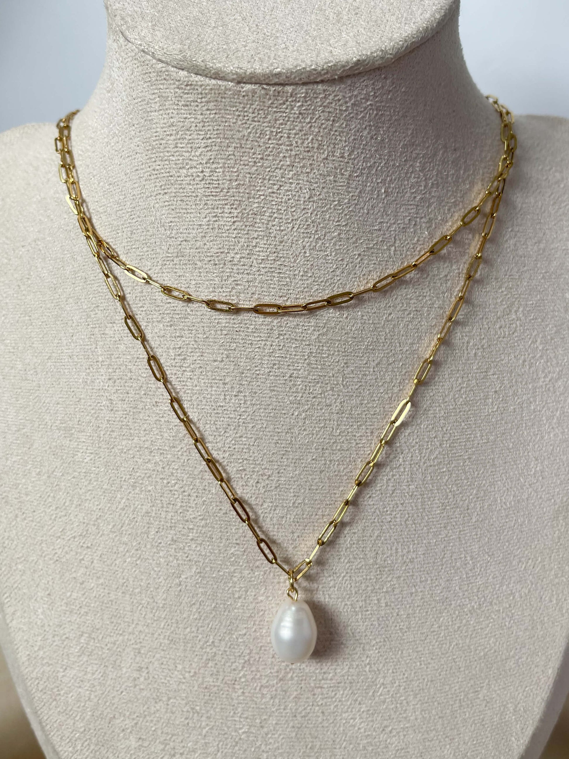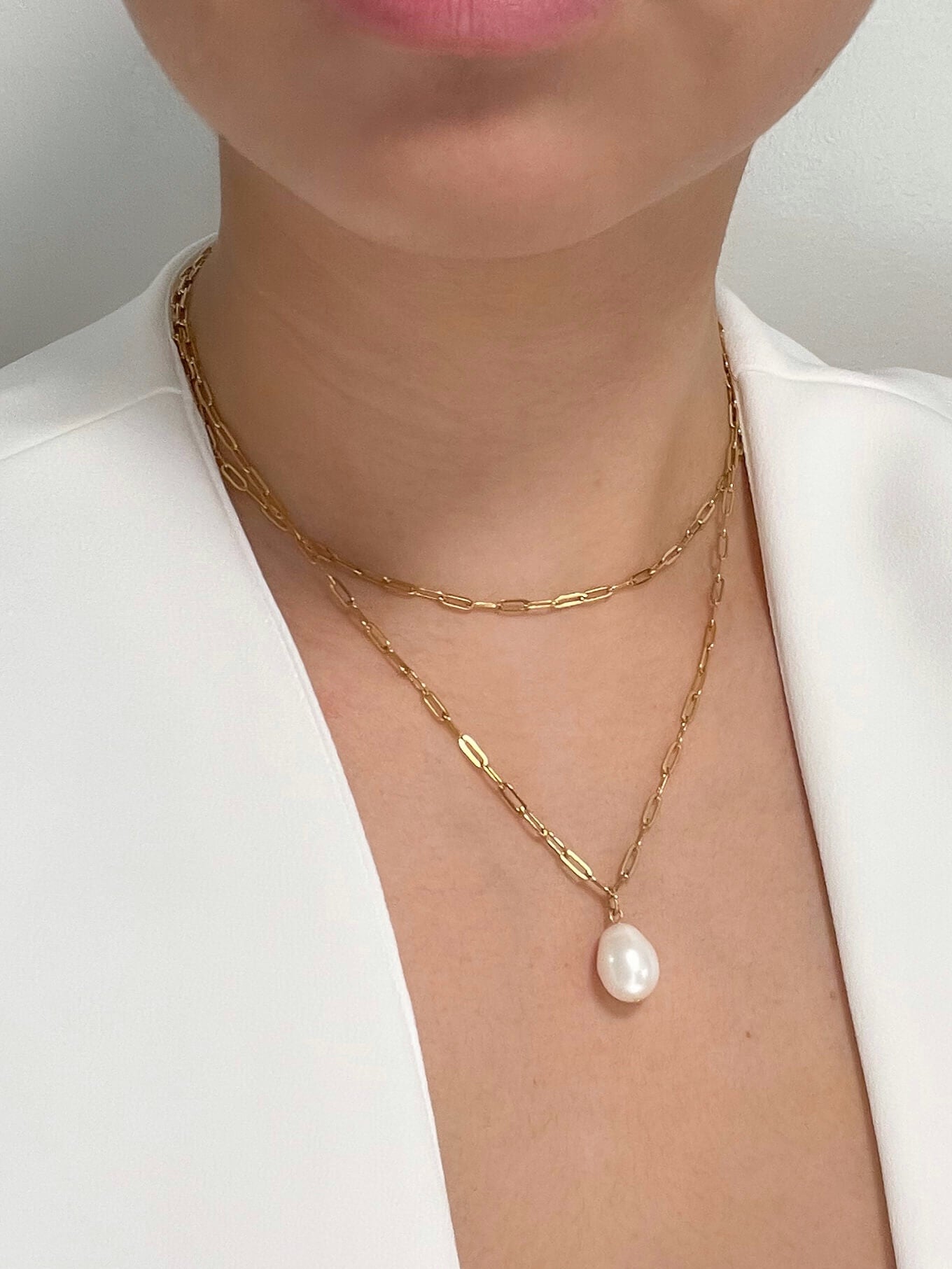 A modern two-layered piece combining a delicate paperclip chain with a 10-11mm freshwater pearl pendant. It's the perfect blend of modern style and classic elegance.