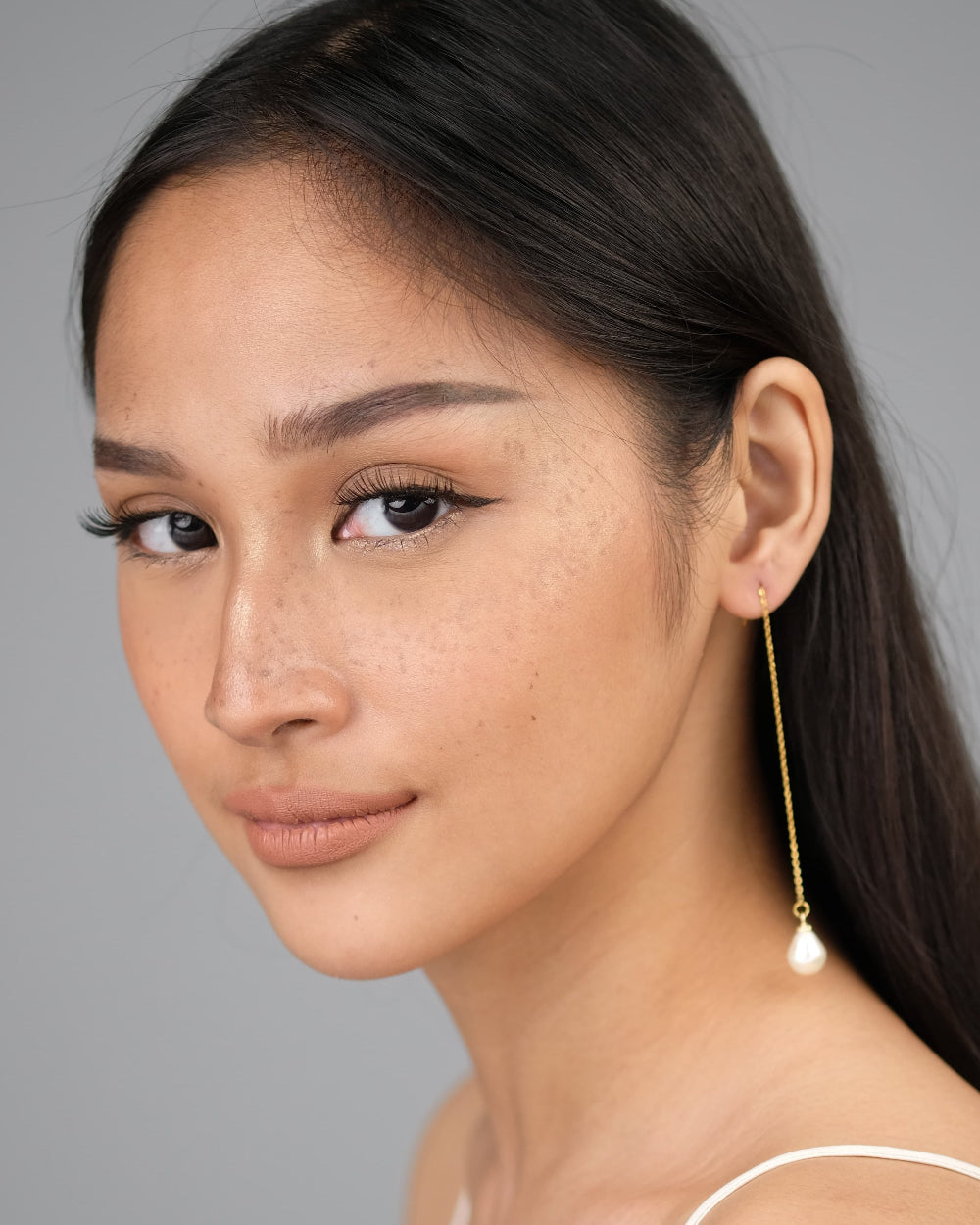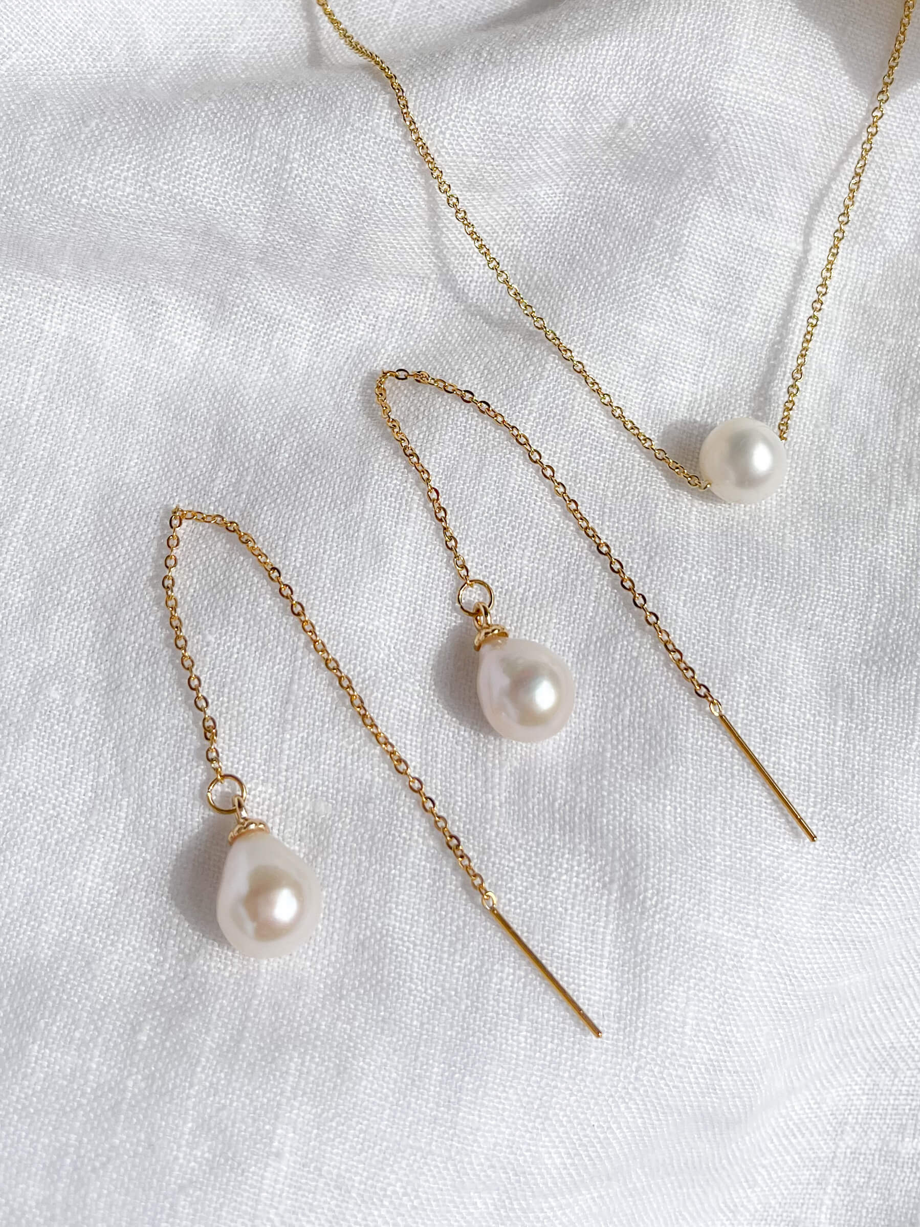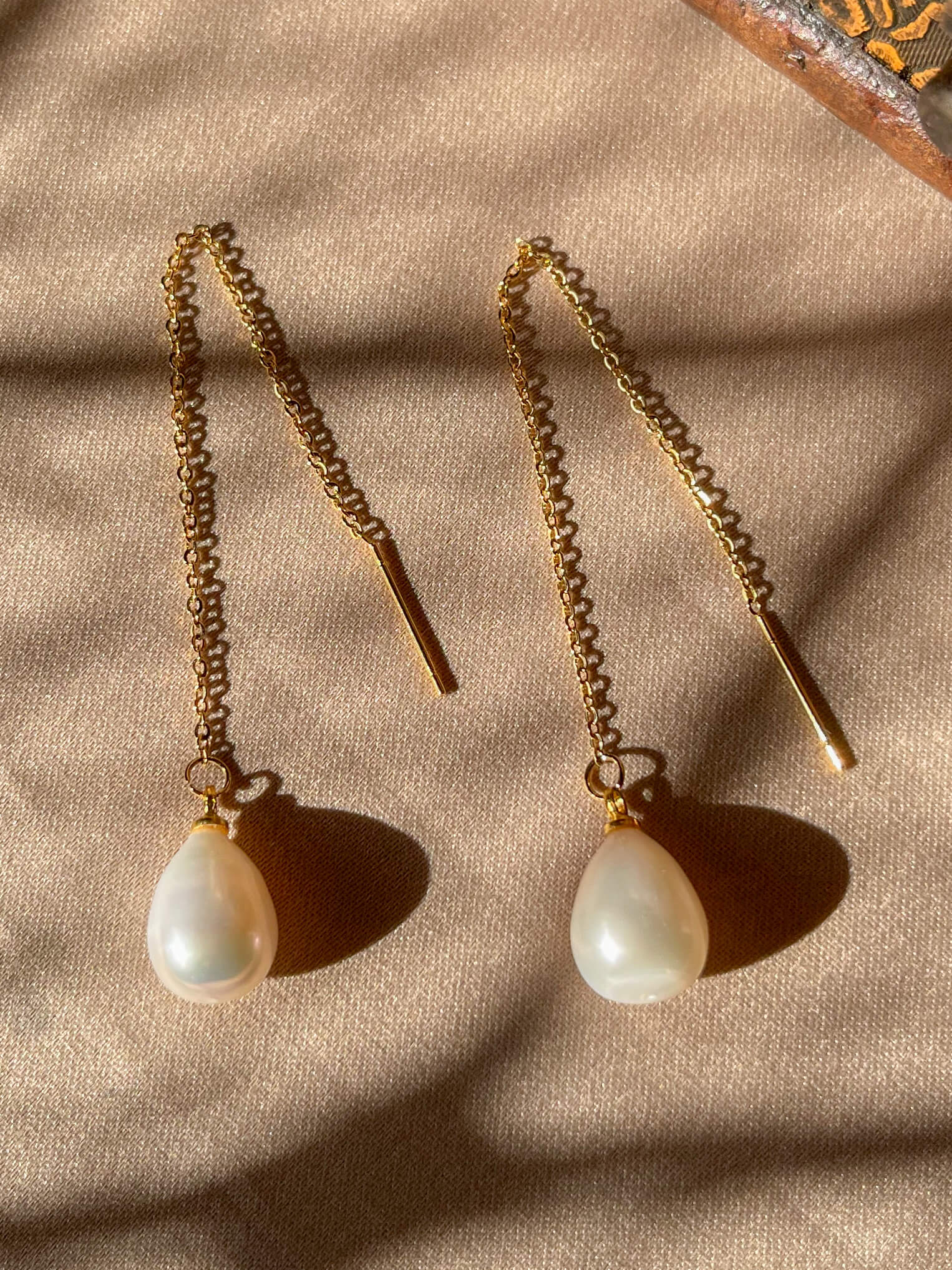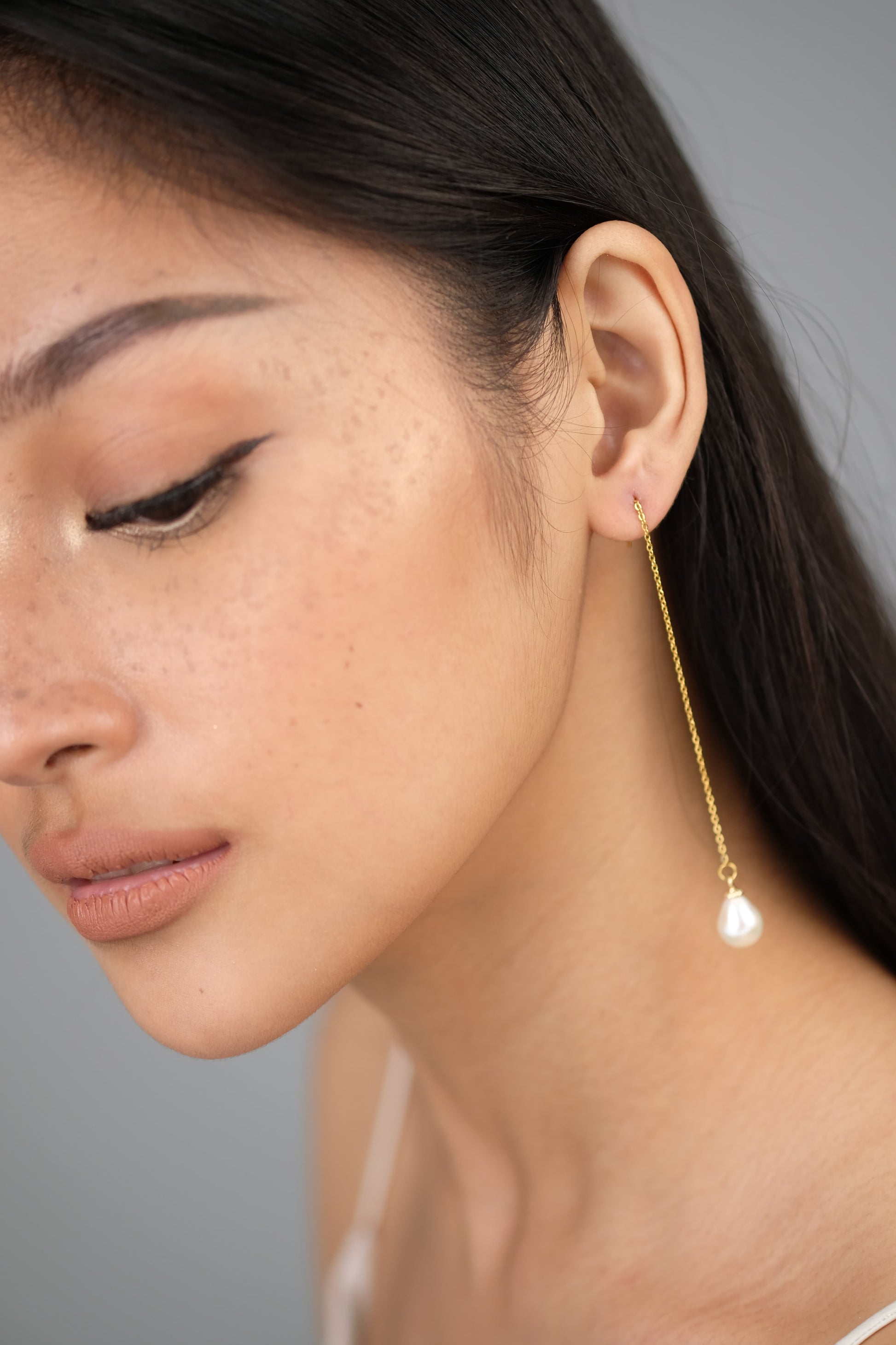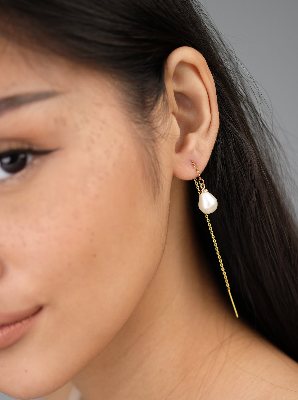 These delicate threader earrings feature lustrous 8-9mm freshwater pearls suspended from a gold plated stainless steel chain. The unique thread-through design offers versatility, allowing you to adjust the drop length to suit your style. Wear them as a classic drop earring or thread the chain through a second piercing for a layered look.