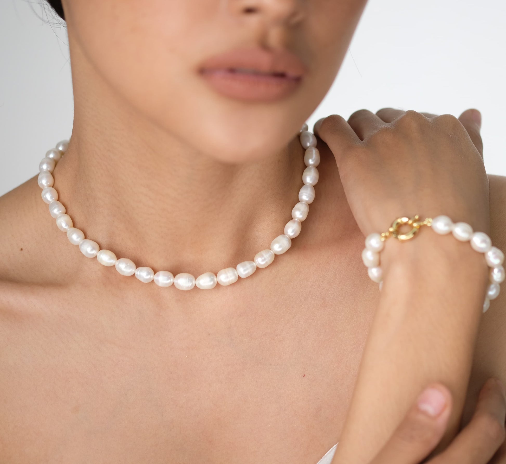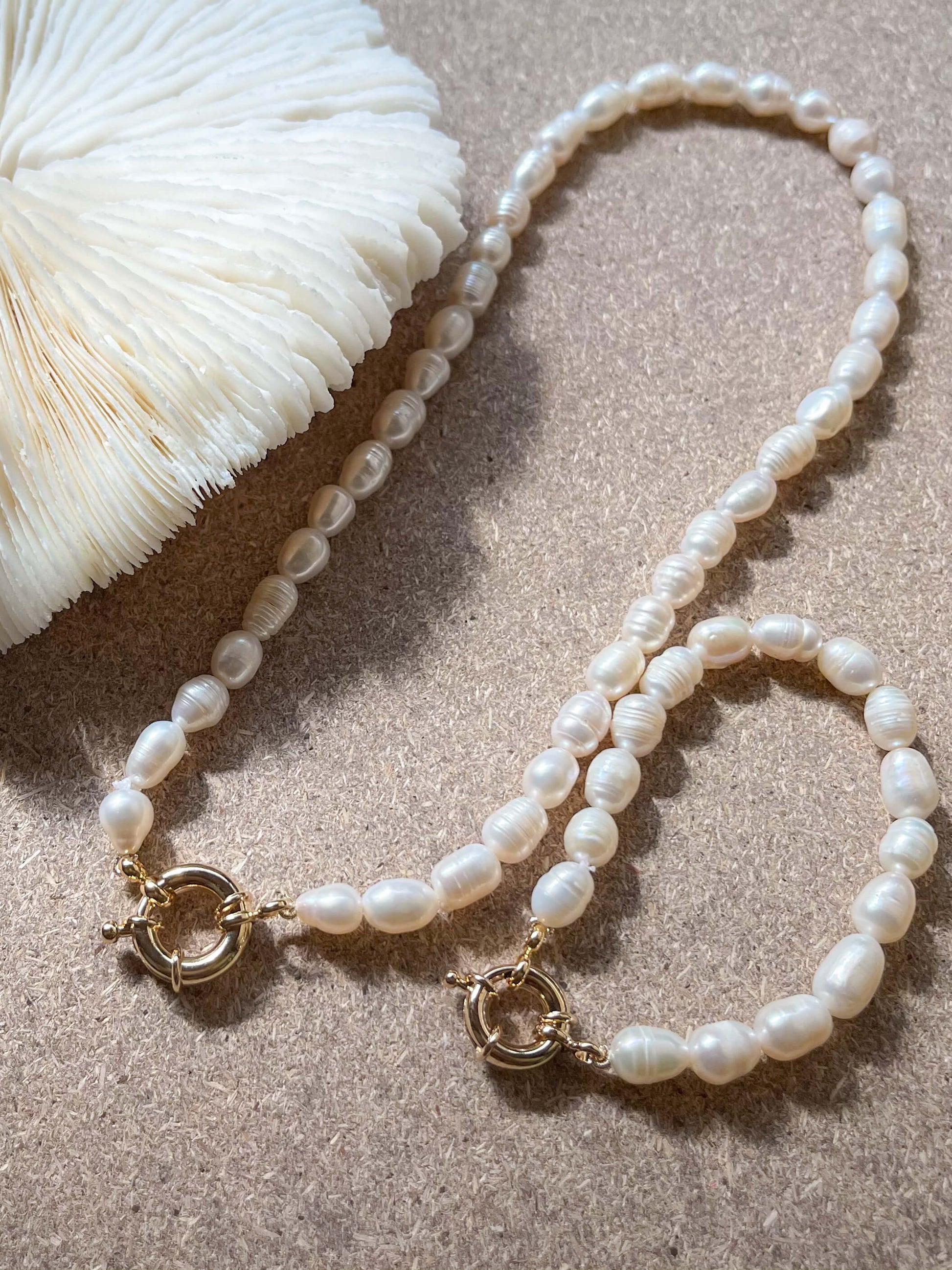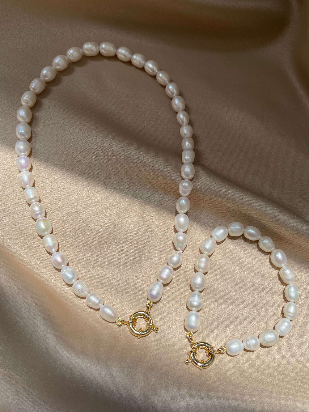 Timeless. Bold. All Pearl. Elevate your look instantly with this captivating necklace and bracelet duo. Each piece is crafted to highlight the natural beauty of the pearls, offering a radiant glow that's both modern and classic. Gold Plated Stainless Steel lock
