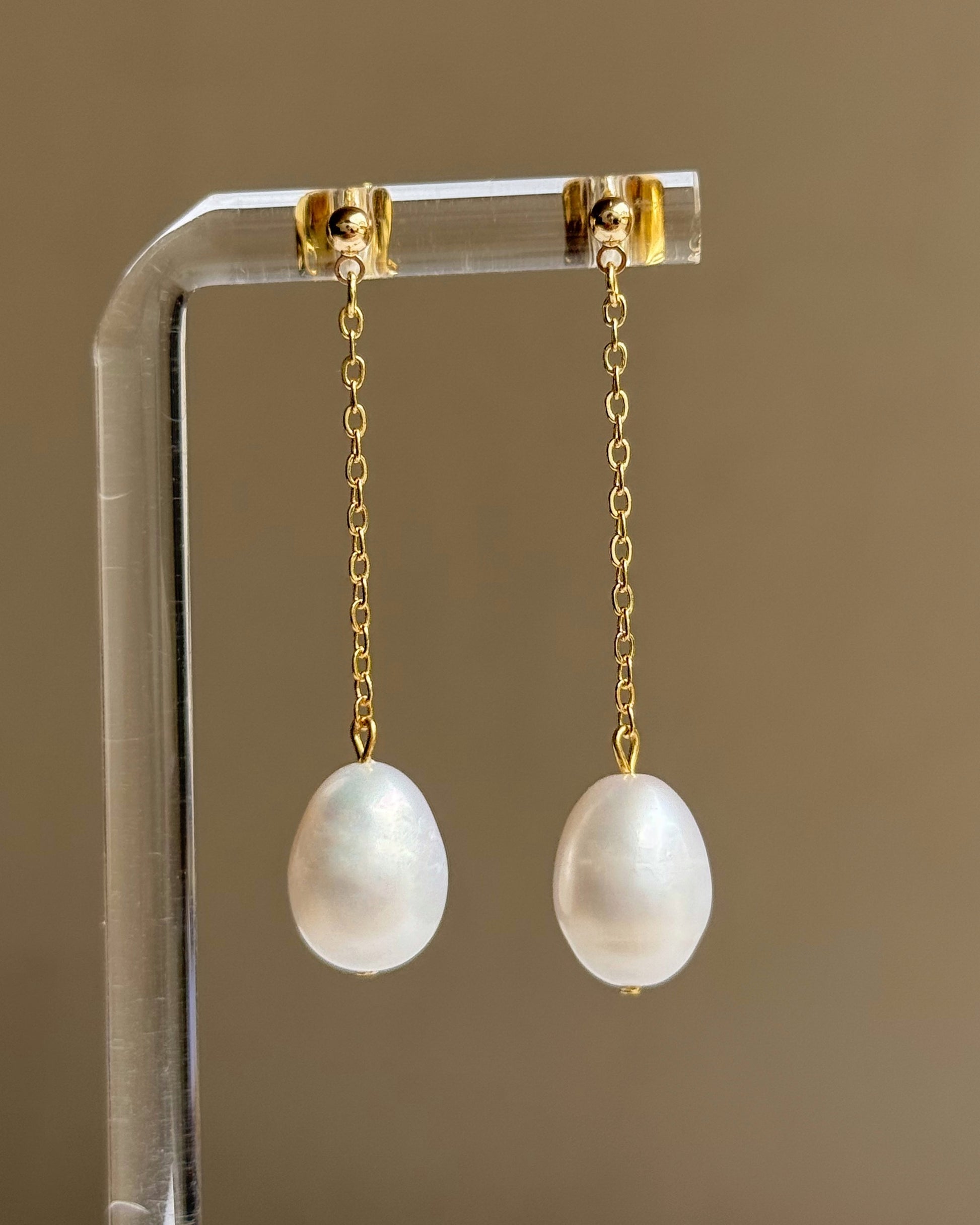Minimalist yet refined. Crafted with a S925 sterling silver ball stud, these earrings combine durability with timeless style. A delicate tarnish-resistant mixed metal chain extends gracefully, holding the 10–11 mm genuine freshwater pearl. Measuring to almost 2 inches in total length, they’re designed to add just the right amount of movement and elegance.